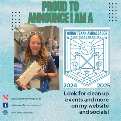 I am proud to announce I have been selected by Keep Texas Beautiful to be a Junior Ambassador! I will be connecting with other youth across the state of Texas to learn, collaborate, and share all things Keeping Texas Beautiful! Please join me on this journey by following my socials and checking out my website: www.ellasocean.com!